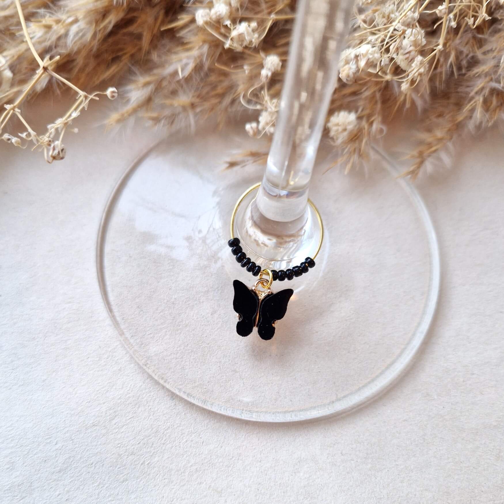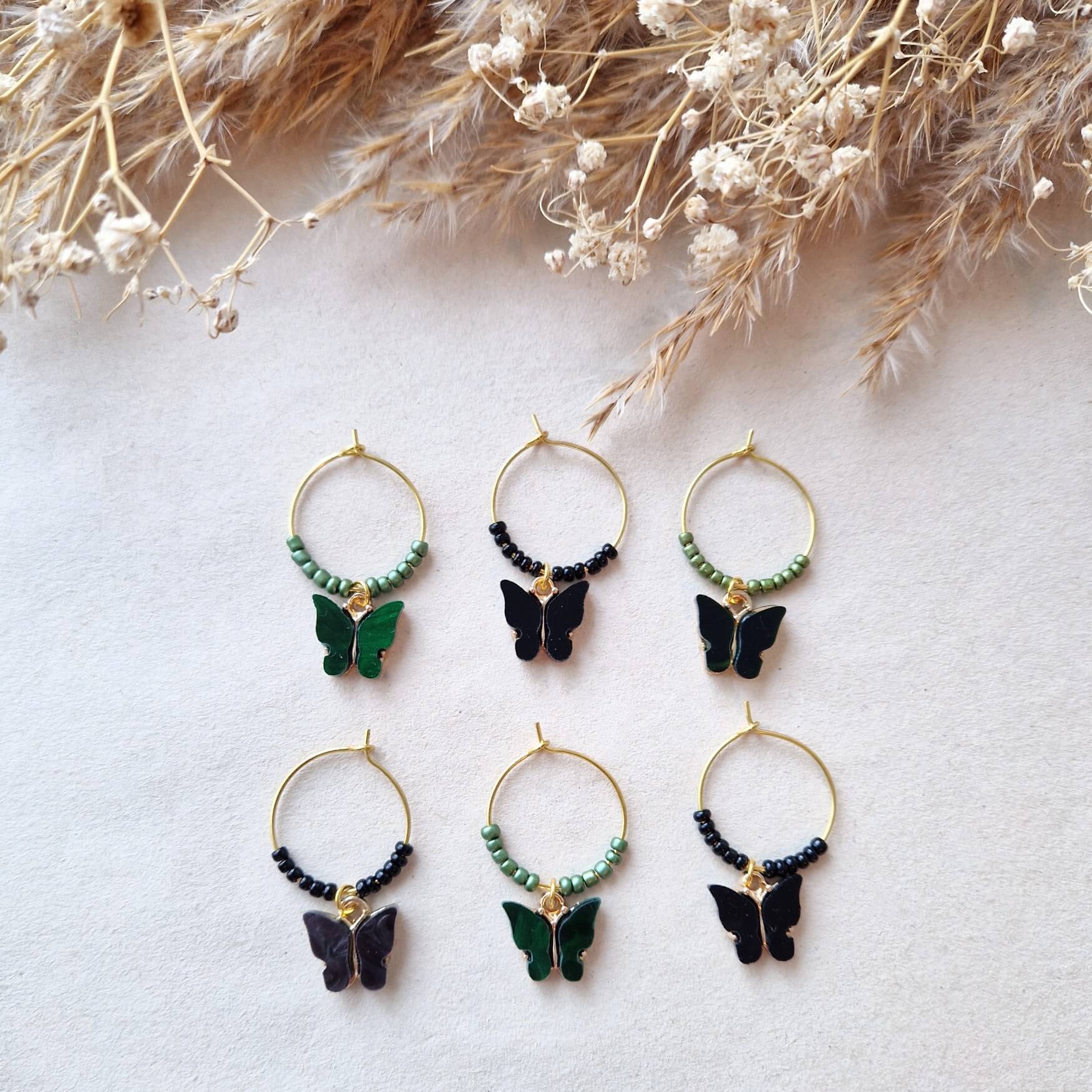 Wijnglasringen in de kleur donkergroen en zwart met een vlinderbedeltje. Te leuk!